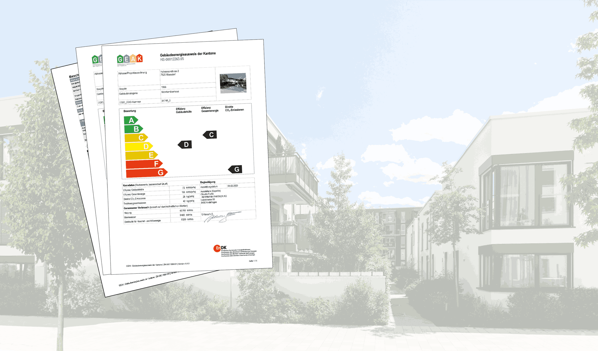 Der GEAK ist das offizielle Schweizer Energiezertifikat und zeigt transparent, wie effizient ein Gebäude ist – von A bis G. Der GEAK Plus geht noch weiter: mit konkreten Sanierungsvorschlägen für eine energieoptimierte Zukunft.